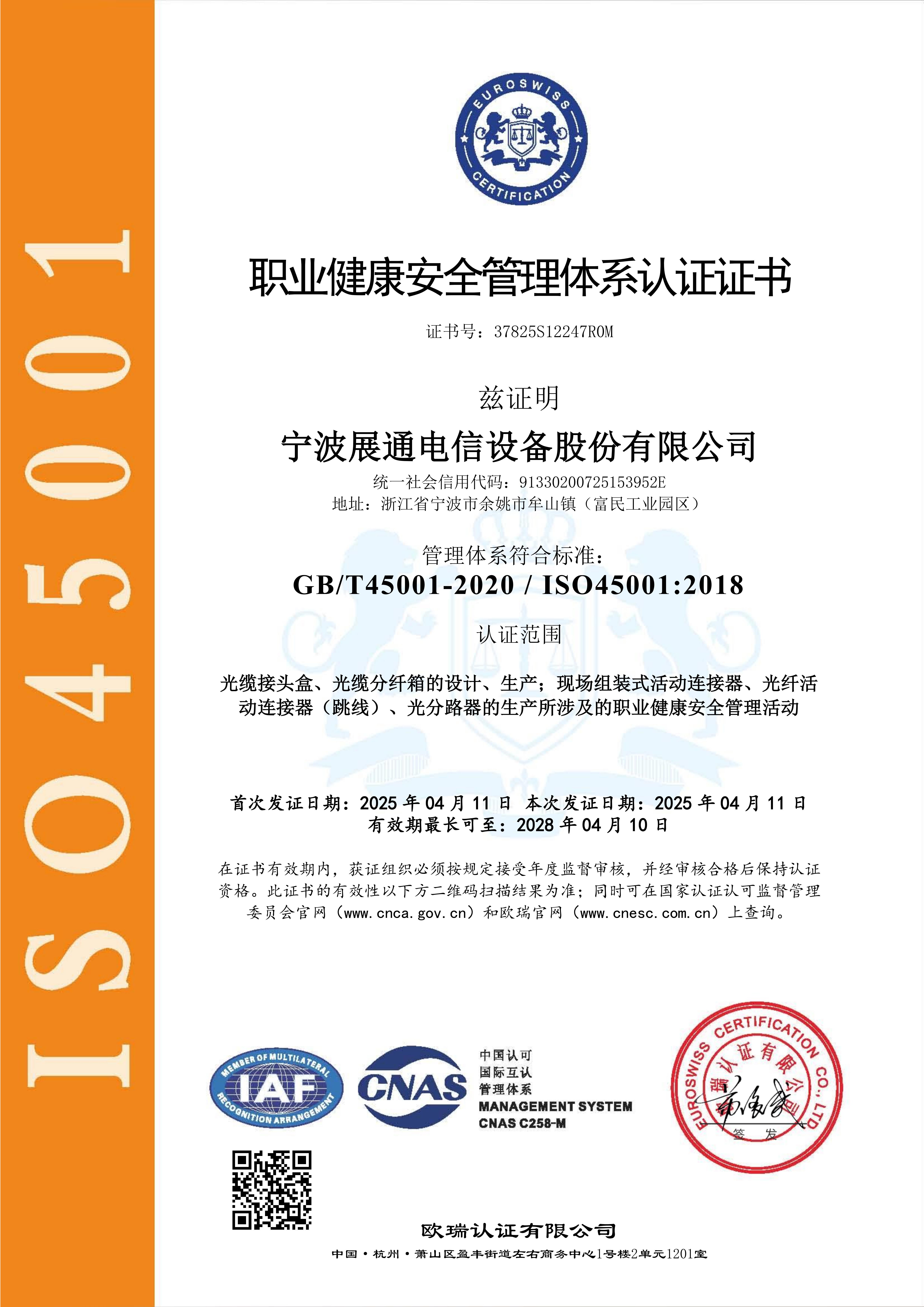 职业健康安全体系证书